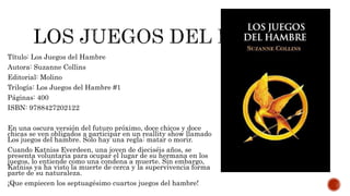La trilogía Los Juegos del Hambre sigue a Katniss Everdeen y su lucha para sobrevivir en unos juegos mortales organizados por el gobierno totalitario del Capitolio. En el primer libro, Katniss se ofrece voluntaria para participar en los Juegos del Hambre en lugar de su hermana. A pesar de las duras pruebas, logra ganar. En el segundo libro, el Capitolio busca venganza contra Katniss, mientras se extiende una rebelión contra el gobierno. En el tercer y último libro, Katn