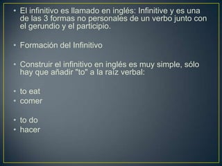 El documento describe el uso del infinitivo en inglés. Explica que el infinitivo tiene dos formas, con "to" (full infinitive) y sin "to" (bare infinitive). Detalla cuando se usa cada forma y los verbos que pueden ir seguidos de un infinitivo, como "want", "try", y "prefer". También cubre los verbos que requieren un objeto adicional tras el infinitivo, como "allow" y "force".
