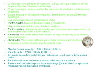 El documento presenta un plan de negocio para abrir una tienda de ropa llamada The New Style en Castuera. La tienda ofrecerá ropa moderna a precios asequibles. Se construirá un edificio de 2000 metros cuadrados en el polígono industrial y contará con ocho empleados. La tienda estará abierta de lunes a viernes y también los sábados por la mañana, ofreciendo ofertas como 2x1 y descuentos de hasta el 50% en rebajas.