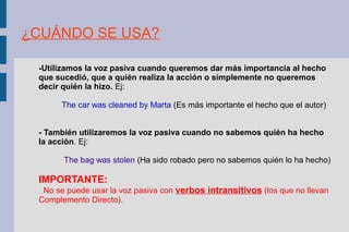 El documento describe el uso de la voz pasiva en inglés. Se utiliza la voz pasiva cuando se quiere dar más importancia al hecho que sucedió que a quién realizó la acción, o cuando no se sabe quién realizó la acción. La estructura de la voz pasiva es sujeto + verbo to be + verbo en participio + objeto. El documento proporciona ejemplos de cómo cambiar oraciones de voz activa a pasiva en diferentes tiempos verbales como presente simple, pasado simple, y futuro.