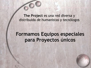 The Project es una red de humanistas y tecnólogos que forman equipos especializados para abordar proyectos únicos que ayuden a las organizaciones e individuos a transitar hacia nuevos modelos de relación en la sociedad digital. El mundo está cambiando rápidamente debido a la tecnología y esto está transformando la forma en que las personas se relacionan, aprenden y trabajan. The Project busca contribuir a mejorar la sociedad aprovechando el potencial humano cuando las personas colaboran y comparten conocimiento a través de modelos de trabajo en red.
