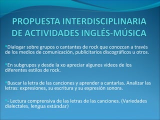 El documento habla sobre el estudio del género musical rock. Propone analizar videos e historias de grupos y cantantes de rock famosos, así como letras de sus canciones. También sugiere crear biografías de músicos, encuestas sobre ellos y comentarios periodísticos simulados para difundir la música rock entre los jóvenes.