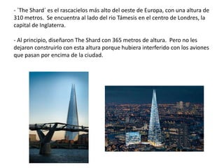 The Shard es el rascacielos más alto de Europa con 310 metros, ubicado en Londres. Fue diseñado en el 2000 por el arquitecto Renzo Piano e inaugurado en 2012. Construido en forma de pirámide de cristal, ofrece vistas panorámicas de la ciudad desde sus observatorios en las plantas más altas. Sin embargo, su impacto en el horizonte de Londres y su rentabilidad económica continúan siendo objeto de debate.