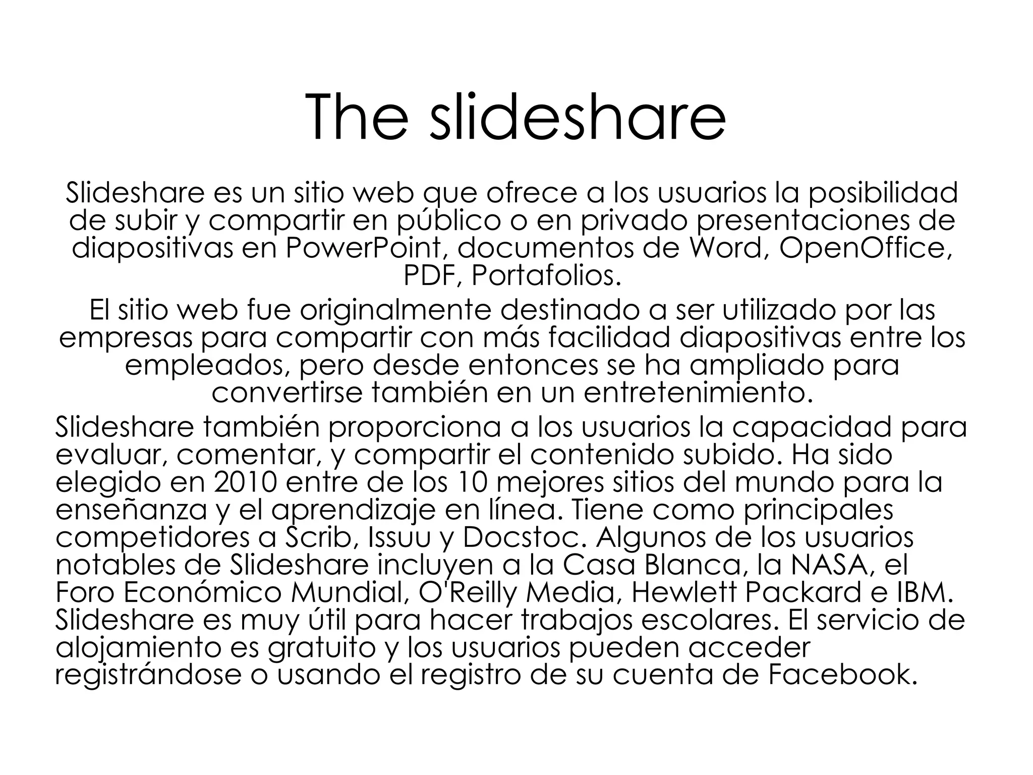 Slideshare es un sitio web que permite a los usuarios subir y compartir presentaciones de diapositivas, documentos y PDF de manera pública o privada. Inicialmente fue creado para que las empresas compartieran presentaciones entre empleados, pero ahora también se usa para entretenimiento. Los usuarios pueden evaluar, comentar y compartir el contenido subido. Slideshare es útil para trabajos escolares y ofrece alojamiento gratuito al registrarse o con una cuenta de Facebook.