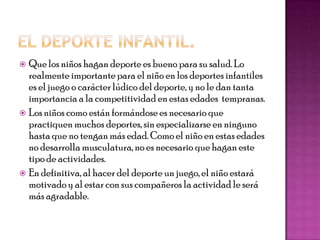 El documento discute que los deportes infantiles deben enfocarse en el juego y diversión en lugar de la competitividad. Recomienda que los niños practiquen múltiples deportes en estas edades tempranas en vez de especializarse. Al hacer del deporte un juego motivador con compañeros, los niños se beneficiarán de la actividad física.