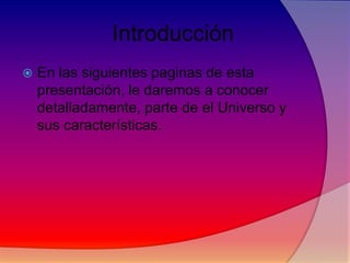 El documento presenta información sobre diversos temas relacionados con el universo y el sistema solar. Explica conceptos como los modelos cosmológicos, las leyes de Kepler y Newton, y describe objetos como asteroides, cometas, satélites y el origen del sistema solar.