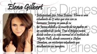 Elena Gilbert es una estudiante de 17 años que vive con su hermano Jeremy tras la muerte de sus padres. En el instituto conoce a Stefan Salvatore, un misterioso estudiante que resulta ser un vampiro. Stefan siente atracción por Elena debido a su parecido con su antiguo amor Katherine Pierce. El hermano de Stefan, Damon, es un vampiro violento sin escrúpulos. Bonnie Bennett es la mejor amiga de Elena y una bruja con grandes poderes.