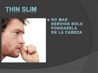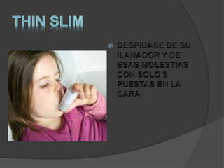 El documento promociona un producto llamado Thin Slim para bajar de peso, mostrando fotos de antes y después de usuarios. Proporciona la dirección y números de teléfono de la oficina de ventas en Dallas, Texas y de la fábrica en Guadalajara, Jalisco, México para conseguir el producto.