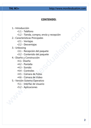 Este documento resume las características y el rendimiento del teléfono inteligente THL W3+. Incluye secciones sobre las especificaciones, el diseño, las cámaras, el sistema operativo Android 4.0.4, y los resultados de pruebas de rendimiento como Quadrant y Antutu. El teléfono ofrece buenas especificaciones como una pantalla táctil de 4.5 pulgadas y cámaras de 8MP y 2MP, a un precio asequible.