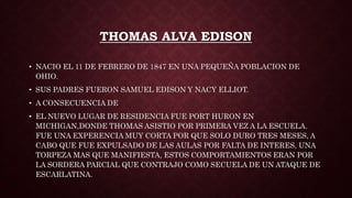 Thomas Alva Edison nació en 1847 en Ohio y mostró interés por la ciencia desde una edad temprana, instalando su primer laboratorio a los 10 años. Trabajó como telegrafista itinerante durante su juventud y se estableció en Nueva York en 1869. Allí inventó la impresora de cotizaciones de valores, su primer gran invento, que le permitió fundar su propio laboratorio de investigación para desarrollar numerosas innovaciones eléctricas revolucionarias.