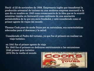Thomas Cook fue un empresario inglés considerado el padre del turismo moderno. En 1841 organizó el primer viaje turístico para más de 500 personas y en 1851 creó la primera agencia de viajes del mundo. Sus innovaciones incluyeron la organización de viajes en grupo, la emisión de cheques de viaje y la promoción del turismo internacional. Sus esfuerzos popularizaron el viaje como actividad recreativa y marcaron el inicio de la industria turística global.