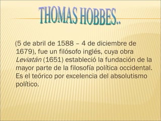 Thomas Hobbes fue un filósofo inglés del siglo XVII conocido por su obra Leviatán, en la que estableció los fundamentos de la filosofía política occidental defendiendo el absolutismo político. Hobbes argumentó que en el estado natural la vida es solitaria, pobre y corta, por lo que los individuos ceden su soberanía al Estado a través de un contrato social para garantizar orden y seguridad. Sus principales intereses fueron la filosofía política, la historia, la ética y la geometría, y fue influenciado por pensadores como Plat