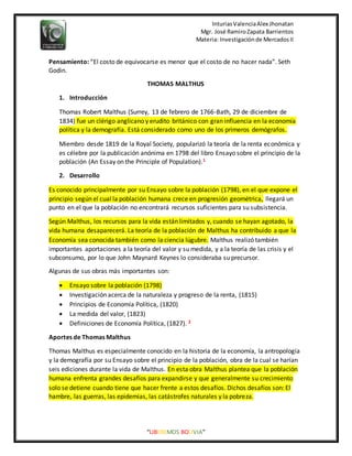 Thomas Malthus fue un influyente demógrafo y economista británico conocido por su ensayo de 1798 sobre el crecimiento poblacional, donde argumenta que la población crece en progresión geométrica, mientras que los recursos lo hacen aritméticamente, lo que podría llevar a la miseria. Aunque su teoría ha sido criticada por falta de evidencias y no considerar avances tecnológicos, su legado perdura en discusiones sobre límites de recursos y el impacto ambiental. Malthus destacó la importancia de reconocer las limitaciones naturales en el crecimiento humano y la producción de alimentos.