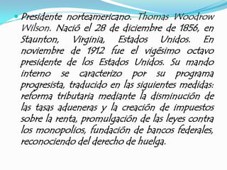 Woodrow Wilson fue el 28o presidente de Estados Unidos. Propuso los 14 Puntos para poner fin a la Primera Guerra Mundial e impulsar un nuevo orden mundial, incluyendo la autodeterminación de los pueblos y la creación de una Liga de Naciones. Participó en la conferencia de paz de París de 1919 donde logró incluir muchos de sus puntos en el Tratado de Versalles, aunque el Senado de EE.UU. rechazó la membresía de su país en la Liga de Naciones.