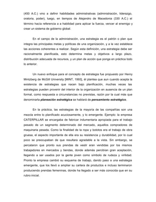 Este documento presenta una introducción al proceso de planeación estratégica para organizaciones. Explica que la estrategia consiste en establecer metas y políticas a largo plazo para alcanzar la visión de la organización, asignando recursos de manera adecuada. También describe los contenidos clave de una estrategia efectiva como el alcance, asignación de recursos y ventajas competitivas. Por último, resume las etapas del proceso de planeación estratégica que incluyen definir la misión, analizar factores internos y externos