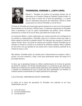 Edward L. Thorndike fue un psicólogo estadounidense que enseñó en el Teachers College de Columbia durante más de 30 años. Se interesó en la teoría del aprendizaje y sus experimentos con pollitos en el sótano de la casa de William James influyeron en el conductismo. Thorndike creía que el aprendizaje en animales y humanos ocurre de forma mecánica a través de ensayo y error, no de razonamiento. Propuso tres leyes fundamentales y cinco leyes menores sobre el aprendizaje.