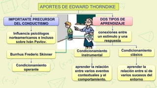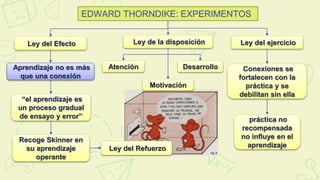 Edward Thorndike hizo importantes contribuciones al conductismo a través de sus experimentos con animales y leyes del aprendizaje. Propuso que el aprendizaje ocurre gradualmente a través de ensayo y error, fortaleciéndose las conexiones entre estímulos y respuestas que resultan en recompensas y debilitándose las que no lo hacen. Sus ideas influyeron en psicólogos conductistas como Skinner.