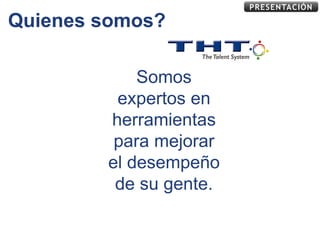 Este documento presenta una empresa de consultoría en gestión de talento humano llamada THT. Ofrecen una solución integral de 16 módulos que combina metodología, tecnología y consultoría para mejorar el desempeño del personal a través de la claridad de objetivos, organización eficiente, inspiración y preparación. Operan en toda Latinoamérica a través de franquicias y ayudan a las empresas a ser más productivas, rentables y con una cultura de resultados.