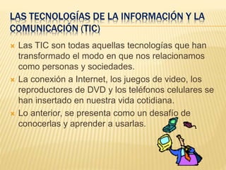 El documento describe conceptos básicos de hardware, software y TIC. Explica que las TIC incluyen tecnologías tradicionales como radio y TV, así como nuevas como internet y celulares. Luego describe los componentes clave de hardware como la CPU, memoria y periféricos, y tipos de software como sistemas operativos y aplicaciones. Finalmente resume diferentes tipos de computadoras como servidores, de escritorio, portátiles y PDA.