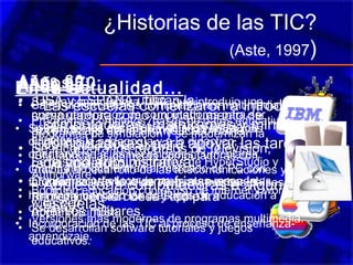 El documento resume la historia y desarrollo de las tecnologías de la información y la comunicación (TIC) en las escuelas desde la década de 1960 hasta la actualidad. En las décadas de 1960 y 1970, las computadoras se introdujeron principalmente para fines administrativos, mientras que en la década de 1980 surgieron las primeras computadoras personales. En la década de 1990 aparecieron las computadoras multimedia y el boom de Internet, y en la actualidad las TIC se han incorporado plenamente en el proceso de enseñanza-aprendiz