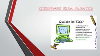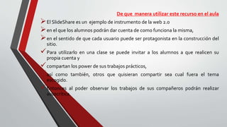 El documento aborda la utilización de Slideshare como una herramienta de la web 2.0 en el aula, fomentando la participación activa de los estudiantes en la creación y compartición de contenido. También destaca los beneficios y desventajas de las tecnologías de la información y la comunicación (TIC), incluyendo la necesidad de alfabetización digital para una participación efectiva en la sociedad tecnológica. Finalmente, aboga por la incorporación de las TIC en la educación para mejorar el aprendizaje y la cooperación entre los estudiantes.
