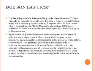 Este documento describe las tecnologías de la información y la comunicación (TIC), incluyendo su historia, componentes clave como las redes, terminales y servicios, y sus aportaciones a la sociedad como el aprendizaje colaborativo. Explica que las TIC agrupan sistemas para administrar información como computadoras e Internet, y que han evolucionado desde el telégrafo hasta incluir Internet, telefonía móvil y GPS.