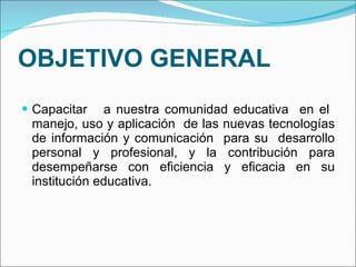 El proyecto busca capacitar a los docentes en el manejo de nuevas tecnologías de información y comunicación (TIC) para mejorar su práctica educativa y cerrar la brecha de analfabetismo tecnológico. Se desarrollarán talleres presenciales y virtuales, se equipará un aula virtual y se realizarán diversas evaluaciones para asegurar el aprendizaje. La duración del proyecto es de octubre a diciembre, con evaluación y certificación para los participantes que completen el curso.