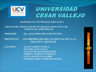 Este proyecto busca capacitar a docentes de niveles primaria y secundaria en el uso y aplicación de las nuevas tecnologías de información y comunicación (TIC) para mejorar su práctica educativa. Se implementarán talleres presenciales y virtuales desde octubre hasta diciembre, con un enfoque constructivista y evaluaciones continuas, enfatizando la importancia de las TIC en la educación. El objetivo es cerrar la brecha tecnológica entre docentes y alumnos, preparando a los educadores para integrar efectivamente estas herramientas en su enseñanza.
