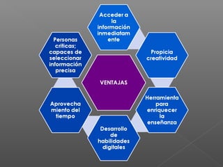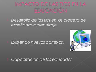 El documento discute el desarrollo de las TIC en los procesos de enseñanza-aprendizaje, lo que exige nuevos cambios y la capacitación de los educadores. También analiza los aspectos positivos y negativos del uso de las TIC en la educación, señalando que la generación nacida en las últimas décadas ha crecido incorporando internet, el teléfono móvil y otros dispositivos de forma natural, a diferencia de las generaciones anteriores nacidas antes de la era digital.