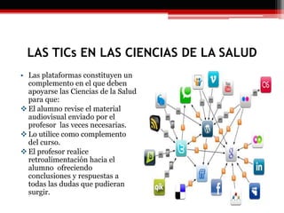 Este documento discute el uso de las TIC (tecnologías de la información y comunicación) en las ciencias de la salud. Señala que las plataformas TIC pueden ser un complemento útil para que los estudiantes revisen materiales del profesor y reciban retroalimentación. También dice que los planes TIC deben adaptarse al perfil de la educación superior basándose en un marco pedagógico. Además, explica que las TIC pueden apoyar a los estudiantes de medicina al brindar mejor información para comprender fenómenos