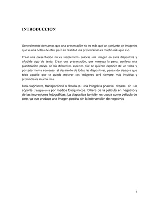 Este documento proporciona información sobre herramientas para crear presentaciones. Explica diferentes tipos de diapositivas como diapositivas de texto, tablas y diagramas. También describe cómo editar diapositivas, insertar objetos multimedia, y aplicar efectos y animaciones. Además, ofrece instrucciones para almacenar, compartir y exportar presentaciones a través de plataformas en línea.