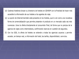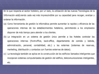 Las tecnologías de la información han revolucionado la industria hotelera, permitiendo reservas en línea y sistemas centralizados de información. Actualmente, los hoteles usan sistemas de gestión de relaciones con clientes, sistemas de gestión de propiedades y tecnología domótica para mejorar la experiencia del cliente y aumentar la rentabilidad. El documento también recomienda algunos sitios web para obtener más información sobre tendencias tecnológicas en la industria hotelera.
