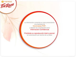 El documento presenta una propuesta de Naranya para crear un sitio web y promociones para la marca Tía Rosa. La propuesta incluye diseñar un sitio con la temática de un comedor mexicano tradicional, crear comunidades en línea y promociones que integren medios web y SMS para aumentar la participación de los usuarios.