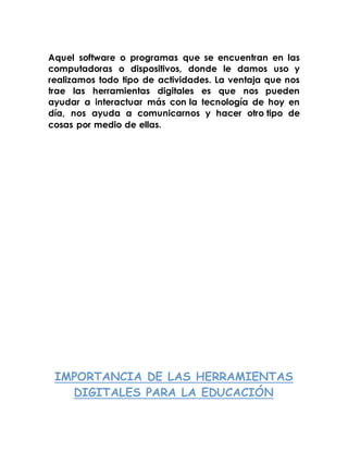 Las herramientas digitales son importantes para la educación actual ya que permiten a los estudiantes acceder a información en internet que complementa sus conocimientos en la escuela. Las herramientas digitales incluyen software y programas que se pueden usar en computadoras u otros dispositivos para interactuar con la tecnología actual y comunicarse. Estas herramientas pueden usarse como objeto de aprendizaje, medio de aprendizaje o apoyo al aprendizaje y son útiles tanto para maestros, estudiantes y padres de familia.