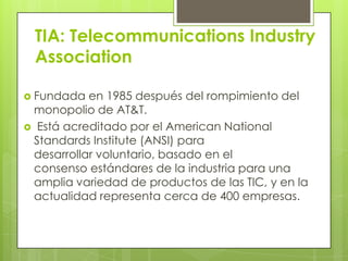 La TIA es una organización que establece estándares voluntarios para la industria de las TIC. Fue fundada en 1985 tras la desregulación de AT&T y representa a 400 empresas. Sus 12 comités de ingeniería desarrollan directrices para equipos de telecomunicaciones. Los estándares más adoptados son aquellos relacionados con infraestructura de datos, cableado estructurado, construcción de vías y sistemas de transmisión de datos.