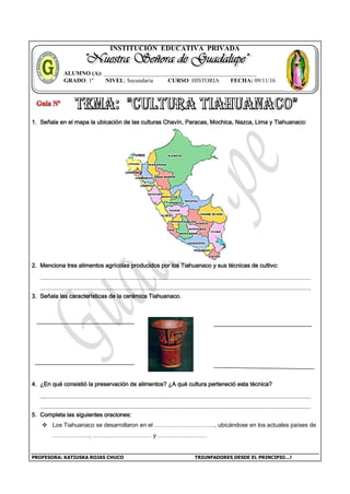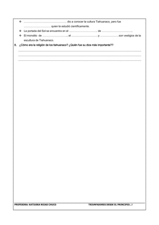 Este documento contiene preguntas sobre la cultura Tiahuanaco y otras culturas preincas como Chavín, Paracas, Mochica y Nazca. Pide ubicar estas culturas en un mapa, mencionar tres alimentos agrícolas de los Tiahuanaco y sus técnicas de cultivo, describir las características de su cerámica y explicar su técnica de preservación de alimentos. También pide completar oraciones sobre el origen geográfico de los Tiahuanaco y los estudiosos que los documentaron, así como