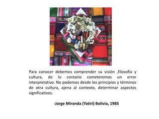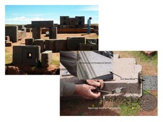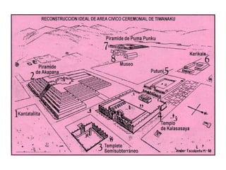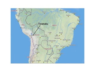 El documento describe la antigua civilización Tiwanaku en Bolivia. Tiwanaku floreció entre los años 500 a.C. y 1100 d.C. y construyó impresionantes estructuras arquitectónicas como la Pirámide de Akapana, el Templo de Kalasasaya y Pumapunku que mostraban avanzadas técnicas de construcción. La civilización Tiwanaku practicaba una vida comunitaria y espiritual y demostró un alto grado de conocimiento tecnológico, pero su razón de desaparición sigue si