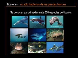 Existen aproximadamente 500 especies de tiburones que varían enormemente en tamaño, desde menos de 25 cm hasta más de 10 metros. Aunque los tiburones son depredadores importantes en los ecosistemas marinos, rara vez atacan a los humanos. Sin embargo, la pesca insostenible pone en peligro a muchas especies de tiburones debido a su lento crecimiento y baja tasa reproductiva.