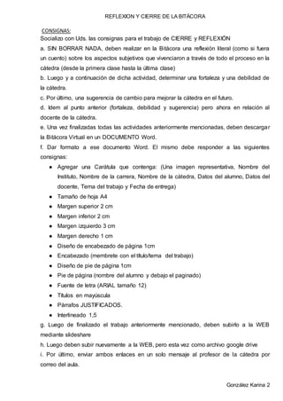 Este documento presenta las instrucciones para completar el trabajo de cierre y reflexión de la bitácora de la asignatura TIC 1 y Educación Física. Incluye realizar una reflexión sobre la experiencia en la cátedra, identificar fortalezas y debilidades, y sugerencias de mejora. También solicita formatear el documento en Word y subirlo a SlideShare y Google Drive, enviando los enlaces al profesor.