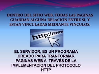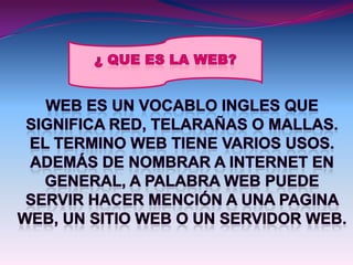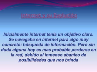 Internet es una red lógica mundial descentralizada de redes de comunicación que utilizan el protocolo TCP/IP. Se remonta a 1969 con la primera conexión de computadoras conocida como ARPANET. La web permite compartir páginas con texto, imágenes, videos y animaciones.