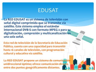 El documento describe varios proyectos educativos implementados con TIC en México. La RED EDUSAT permite transmitir hasta 16 canales educativos vía satélite. La Enciclopedia Virtual de Tecnología Educativa es una enciclopedia en línea sobre tecnología educativa. El Proyecto Vasconcelos lleva computadoras portátiles y equipamiento a comunidades rurales. Las escuelas virtuales permiten estudiar en línea sin asistir físicamente a una institución. Las telesecundarias utilizan recursos TIC para que