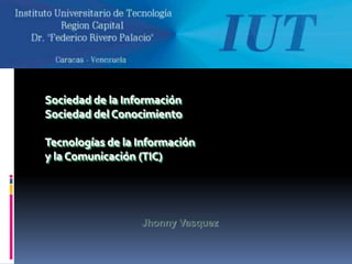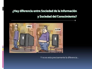 El documento compara y contrasta la sociedad de la información y la sociedad del conocimiento. Define la sociedad del conocimiento como un estado posterior a la sociedad de la información donde las personas transforman la información en conocimiento útil mediante sus habilidades intelectuales y el apoyo de las TIC para generar aprendizaje colaborativo. Explica que el verdadero reto es desarrollar habilidades cognitivas que permitan la apropiación, uso y aplicación de la información y el conocimiento.