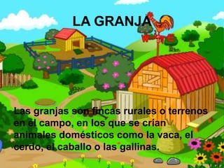 Este documento presenta los diferentes animales que se pueden encontrar en una granja, incluyendo vacas, cerdos, caballos, cabras, conejos, gallinas, ovejas, patos, perros y más. Cada animal se describe brevemente, destacando lo que proveen a los humanos como la leche, la carne, los huevos y otros productos.
