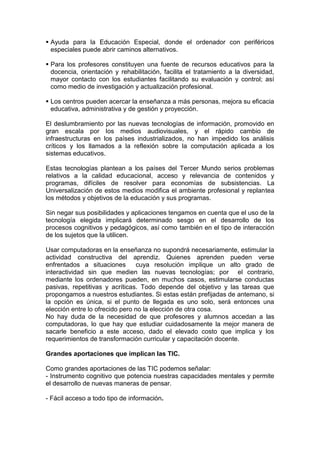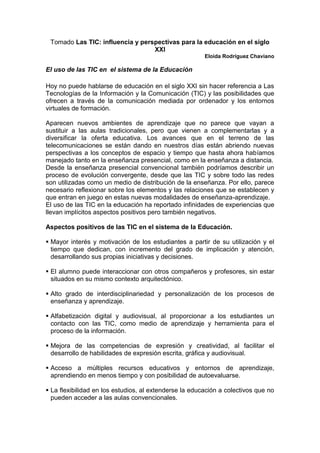 El documento discute el uso de las tecnologías de la información y la comunicación (TIC) en la educación del siglo 21. Señala que las TIC ofrecen nuevos entornos de aprendizaje que complementan las aulas tradicionales y diversifican la oferta educativa. También menciona algunos aspectos positivos de las TIC como mayor motivación de los estudiantes, interacción entre compañeros independientemente de su ubicación, y acceso a recursos educativos. Sin embargo, advierte que el uso de la tecnología puede sesgar los