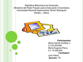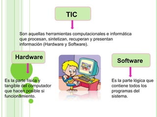 El documento describe las Tecnologías de la Información y la Comunicación (TIC) como herramientas computacionales e informáticas que procesan y presentan información. Explica que el hardware es la parte física del computador mientras que el software contiene los programas. También discute ventajas y desventajas de las TIC en la educación y diferencias entre el paradigma tradicional y el emergente con TIC.