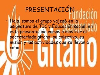 El Secretariado Gitano es una entidad sin ánimo de lucro que trabaja para promover la integración de la comunidad gitana en España y Europa a través del respeto a su identidad cultural y la lucha contra la discriminación. Aborda áreas como el empleo, la educación, la salud y la vivienda, y busca colaboración para ayudar a los jóvenes gitanos a construir un futuro con esperanza.
