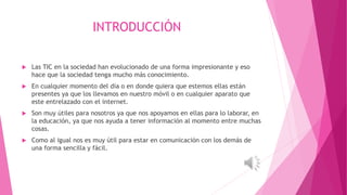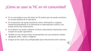 Las TIC se usan ampliamente en la comunidad del autor. Se usan en educación para obtener información y aumentar el conocimiento, en el trabajo para crear y almacenar documentos importantes, y para comunicarse fácilmente con otros. El compañero del autor usa las TIC para comunicarse con seres queridos lejos, publicar contenido y buscar información en línea.