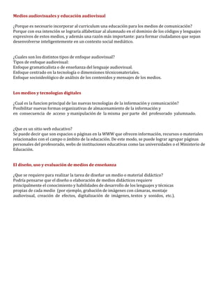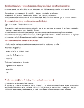El aprendizaje con medios en contextos educativos es un proceso complejo que depende de múltiples factores relacionados con los estudiantes, los materiales y el contexto. Los medios didácticos son recursos tecnológicos diseñados para facilitar el aprendizaje y transmitir conocimiento de forma simbólica. Entre los medios más comunes se encuentran los impresos, la imagen fija, la imagen en movimiento y los audiovisuales. Las nuevas tecnologías posibilitan nuevas formas de almacenar y acceder a