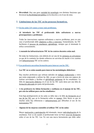 El documento describe las posibilidades y limitaciones del uso de las tecnologías de la información y la comunicación (TIC) en los procesos educativos. Entre las posibilidades se encuentran la interactividad, la instantaneidad, la digitalización de contenidos y la innovación. Sin embargo, también existen limitaciones como la falta de formación de los profesores, las distracciones de los estudiantes y los altos costos de implementar las TIC a gran escala. Para sacar el máximo provecho de las TIC en la educación, se requiere superar estas limitaciones median