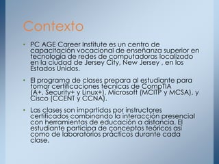PC AGE Career Institute es un centro de capacitación técnica en Nueva Jersey que prepara a estudiantes para certificaciones en tecnología de la información. Los estudiantes usan herramientas de aprendizaje en línea como TestOut LabSim y MindLeaders para complementar las clases presenciales. Se propone usar el sistema Haiku LMS para crear foros de discusión moderados que permitan mayor interacción entre estudiantes fuera del aula y así mejorar el aprendizaje y éxito estudiantil.